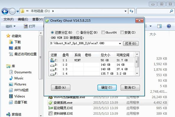 3、雙擊【安裝系統(tǒng).exe】,打開安裝工具onekey ghost,選擇“還原分區(qū)”,加載映像路徑win7.gho,選擇安裝位置如C盤,點擊確定。