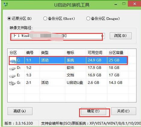 6、進(jìn)入pe系統(tǒng),打開u啟動裝機(jī)工具,選擇win7系統(tǒng)鏡像,分區(qū)為C盤,點(diǎn)擊確定。