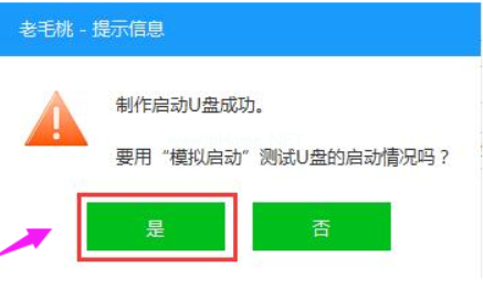 8、U盤(pán)啟動(dòng)盤(pán)制作完成后,會(huì)彈出一個(gè)窗口,提示制作啟動(dòng)U盤(pán)成功。要用“模擬啟動(dòng)”測(cè)試U盤(pán)的啟動(dòng)情況嗎?我們點(diǎn)擊“是”