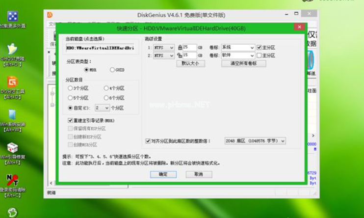5、設(shè)置分區(qū)數(shù)目和分區(qū)的大小,通常C盤建議35G以上,如果是固態(tài)硬盤的話,勾選“對齊分區(qū)”即可4k對齊,點(diǎn)擊確定,執(zhí)行硬盤分區(qū)過程;