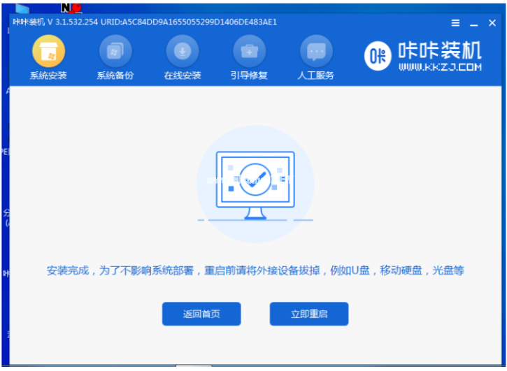 9、進(jìn)入系統(tǒng)之后,點(diǎn)擊打開咔咔軟件就會開始安裝系統(tǒng)。系統(tǒng)安裝完成后,就請按照提示再次點(diǎn)擊重啟電腦