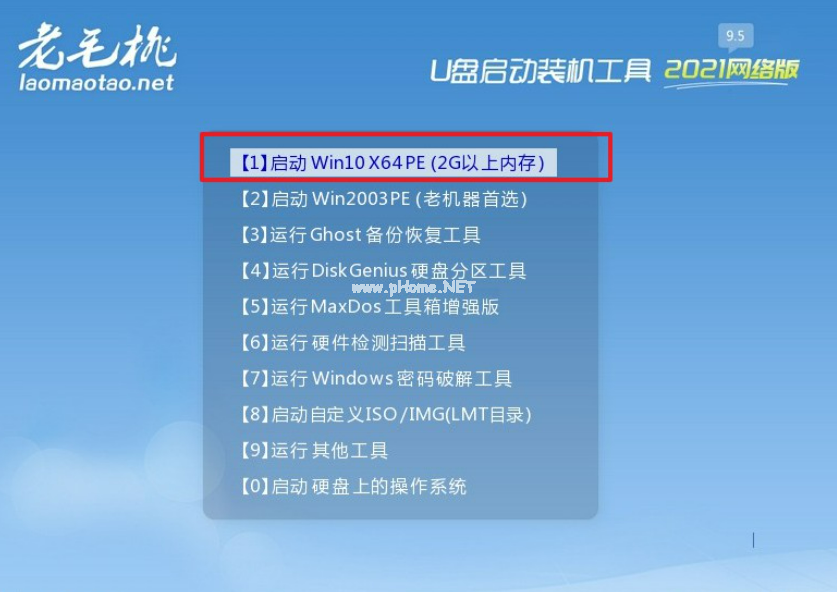 2、進(jìn)入老毛桃PE選擇界面,選擇【1】啟動(dòng)Win10 X64P E(2G以上內(nèi)存),回車進(jìn)入即可。