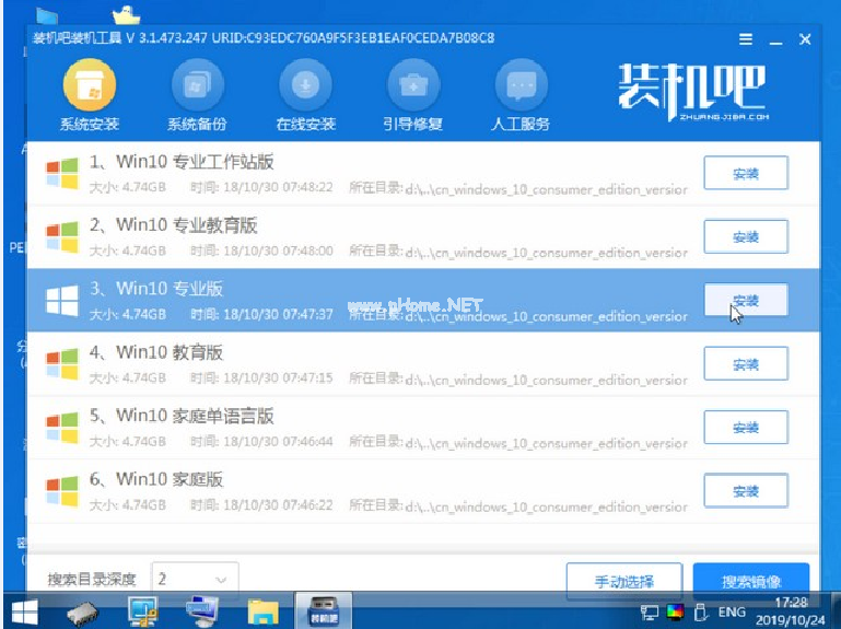 5、接著在pe系統(tǒng)上打開裝機(jī)吧裝機(jī)工具,選擇需要安裝的系統(tǒng)安裝到c盤上。