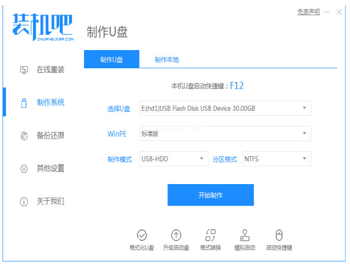 1、打開裝機吧一鍵重裝系統(tǒng)工具,插入U盤,選擇U盤開始制作;