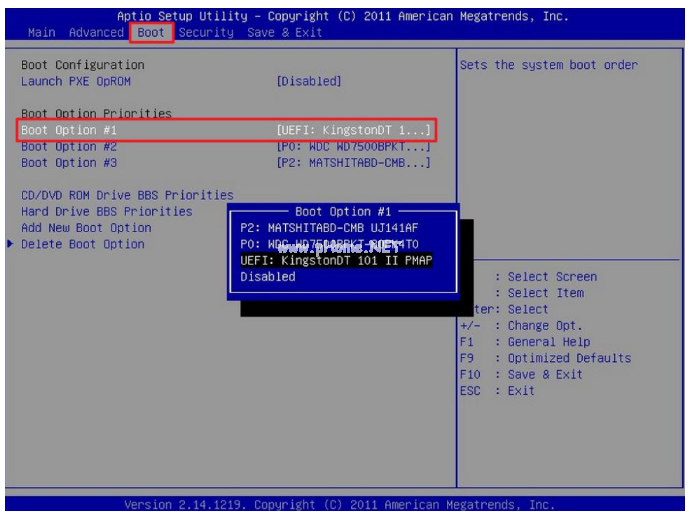 6、進(jìn)入界面之后在Boot里選擇Boot Option #1,接著再選擇UEFI:KingstonDT 101 II PMAP。