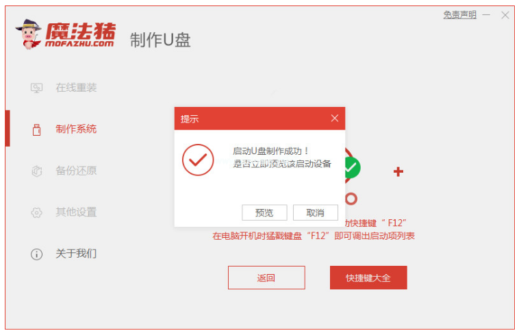 3、提示“啟動u盤制作成功”后,快速預(yù)覽需要安裝的電腦主板的啟動熱鍵,然后拔掉出u盤退出。