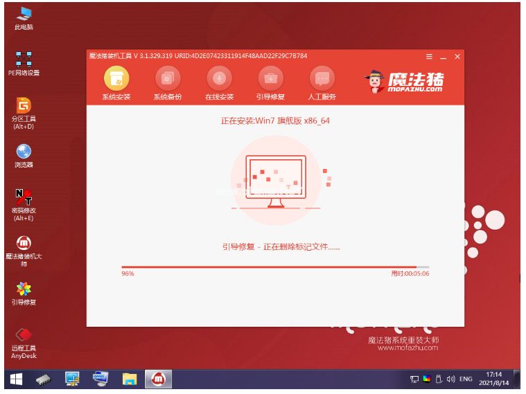 5、在pe系統(tǒng)桌面上地啊你打開魔法豬裝機工具,選擇我們需要安裝的win7系統(tǒng)點擊安裝到電腦c盤上。