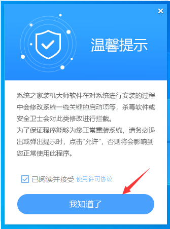 1、首先,關(guān)閉所有的殺毒軟件,然后運(yùn)行系統(tǒng)之家裝機(jī)大師軟件,軟件會進(jìn)行提示,仔細(xì)閱讀后,點(diǎn)擊我知道了進(jìn)入工具。