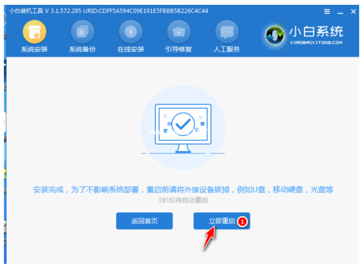 7、裝機工具自動完成安裝,點擊立即重啟電腦。
