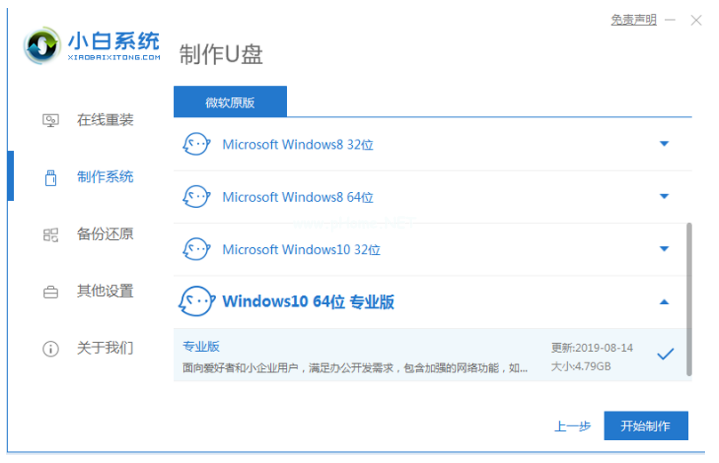 2、選擇本次需要安裝的win7系統(tǒng),點擊開始制作。