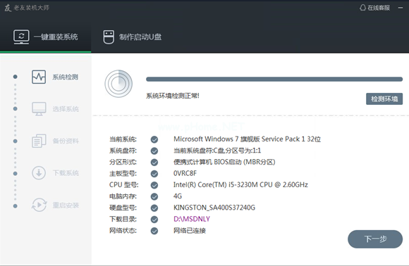 1.下載軟件完軟件后正常打開(kāi)(“一鍵重裝系統(tǒng)”),程序會(huì)默認(rèn)檢測(cè)當(dāng)前系統(tǒng)環(huán)境,檢測(cè)完成后,點(diǎn)擊“下一步”。
