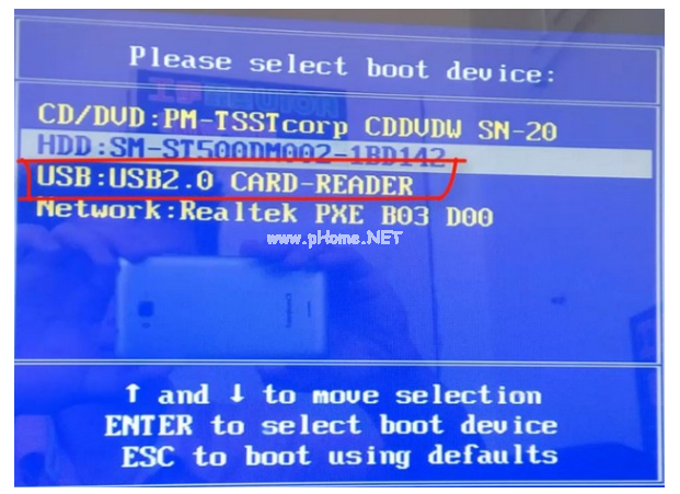 6、再將u盤(pán)插入需要重裝的電腦接口,開(kāi)機(jī)快速斷續(xù)的按熱鍵進(jìn)入快速啟動(dòng)菜單頁(yè)面,選擇u盤(pán)啟動(dòng)項(xiàng)按回車(chē)。
