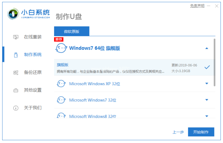 2、再選擇需要安裝的win10系統(tǒng),然后點(diǎn)擊開(kāi)始制作啟動(dòng)盤(pán)。