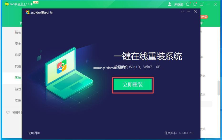 2、進入系統(tǒng)重裝界面,在新出現(xiàn)的360系統(tǒng)重裝大師界面,點擊立即重裝。