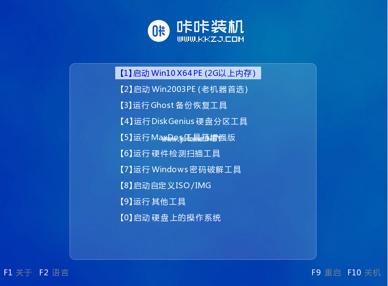 5、繼續(xù)選擇第一項咔咔裝機pe系統(tǒng)回車進入。