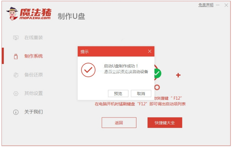 3、等待軟件制作u盤啟動(dòng)盤成功后,先預(yù)覽需要安裝的電腦主板的啟動(dòng)熱鍵,再拔除u盤退出就可以了。