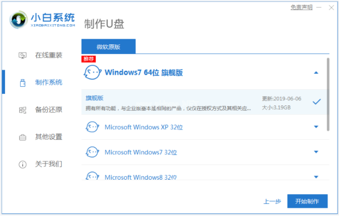 2、選擇我們需要安裝的系統(tǒng),鼠標(biāo)點(diǎn)擊開(kāi)始制作啟動(dòng)盤(pán)。