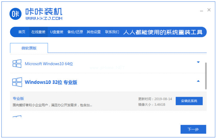 1、我們下載安裝咔咔裝機(jī)工具,選擇安裝的系統(tǒng)版本,點(diǎn)擊下一步。