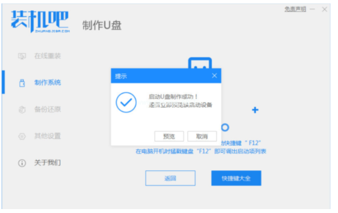 3.等待裝機(jī)軟件制作u盤(pán)啟動(dòng)盤(pán)成功后,快速預(yù)覽需要安裝的電腦主板的啟動(dòng)熱鍵,再拔除u盤(pán)退出。