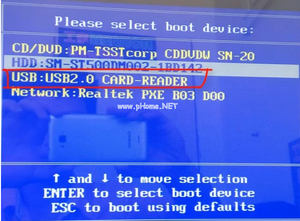 6、把u盤插入需要裝系統(tǒng)電腦接口,然后開機(jī)按熱鍵進(jìn)入啟動(dòng)項(xiàng)的界面,選擇USB項(xiàng),按回車鍵進(jìn)入。