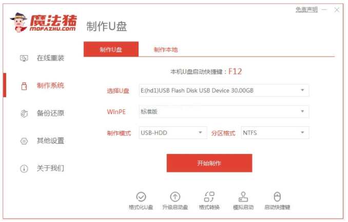 1、打開魔法豬裝機(jī)大師工具,制作win7 u盤啟動(dòng)盤。