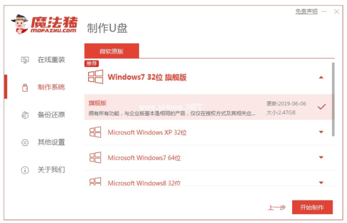 2、選擇win7系統(tǒng),接著點(diǎn)擊開始制作。