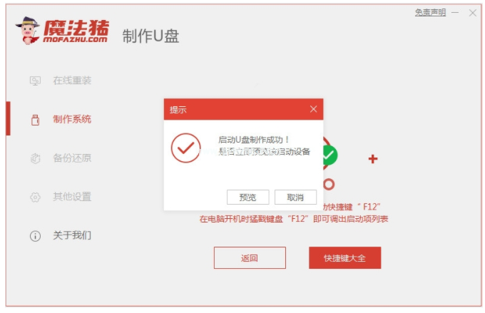 3、等待軟件制作u盤啟動(dòng)盤,快速預(yù)覽需要安裝的電腦主板的啟動(dòng)熱鍵,然后再拔除u盤退出。