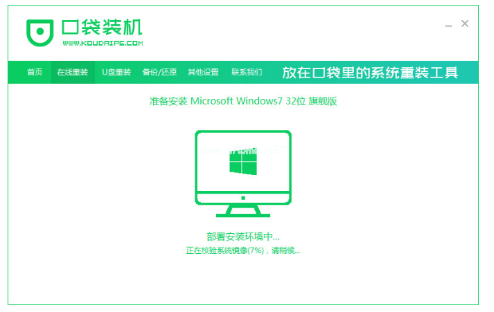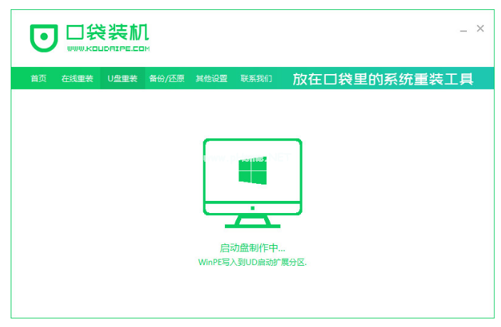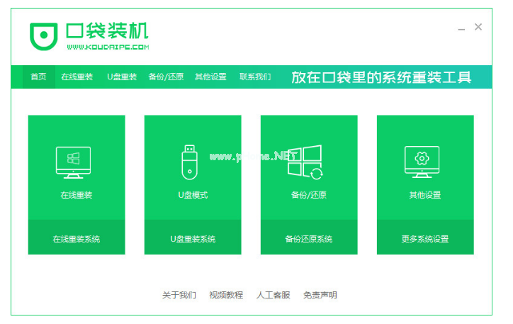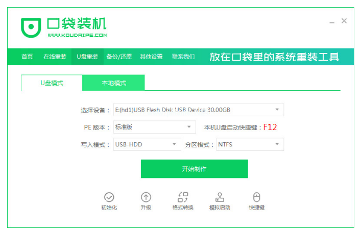 1、先下載口袋裝機工具軟件,再插入U盤,點擊U盤重裝系統(tǒng)。