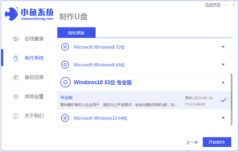 2、根據(jù)自己的需要選擇win10系統(tǒng),點擊開始制作u盤啟動盤。